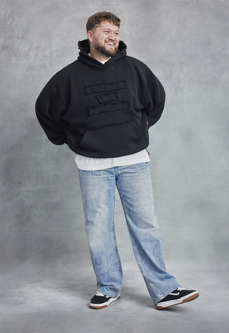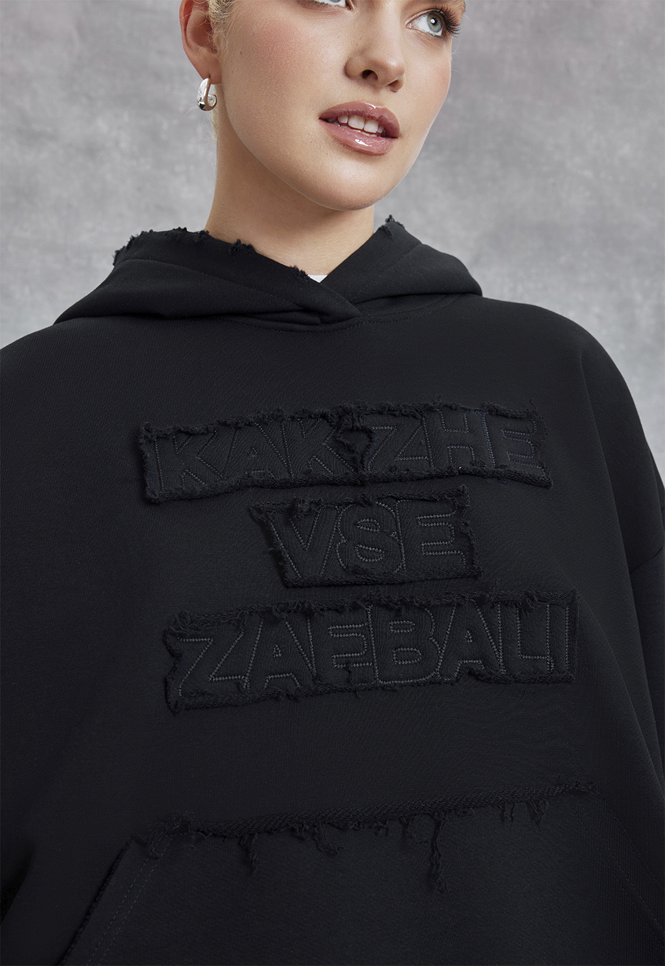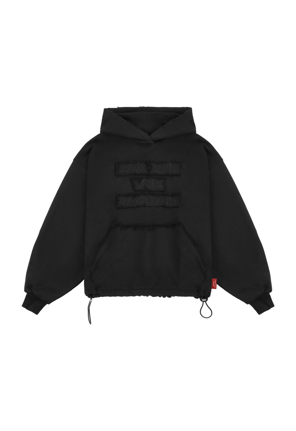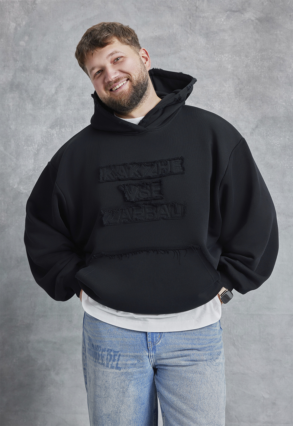 Черное худи от Приятного Ильдара "Kak zhe Vse za*bali" oversize кроя выполнен из высококачественного плотного хлопка плотностью 320 гр/м2 с бархатным эффектом. Нанесение сделано машинной вышивкой, также в изделии присутствуют декоративные потертости и регуляторы внизу для изменения объема