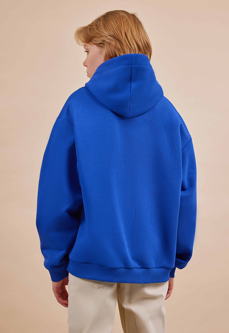 Модель имеет круглый ворот, прямой крой, объемный капюшон и карман спереди. Принт на груди нанесен методом DTF, на левом рукаве логотип выполнен машинной вышивкой.