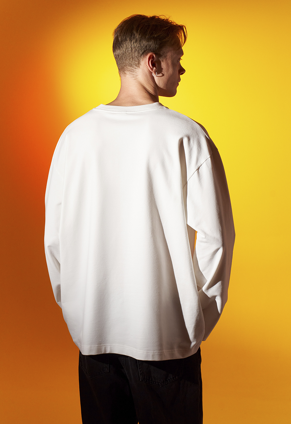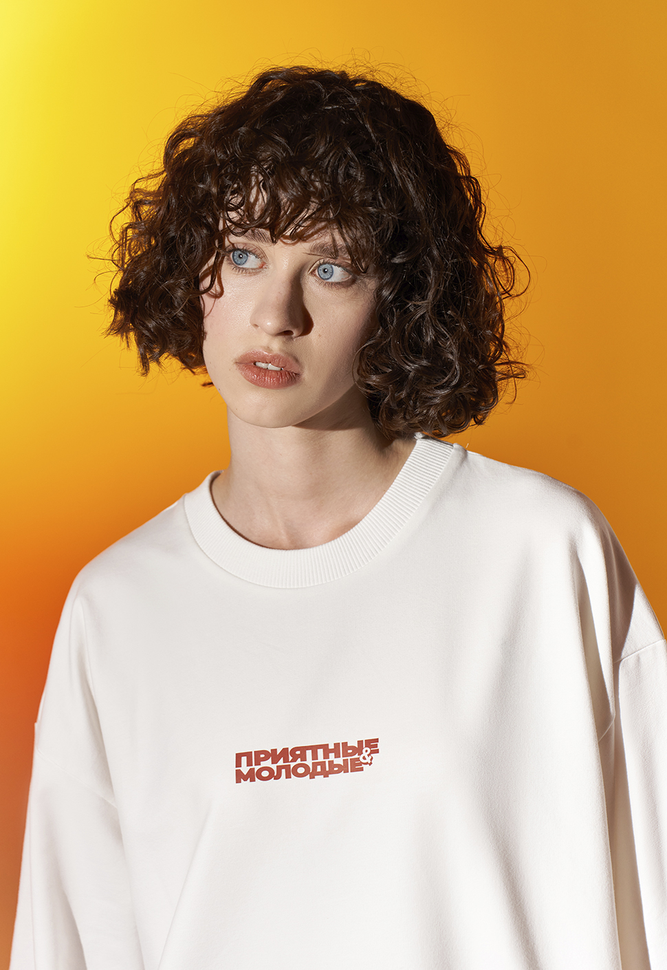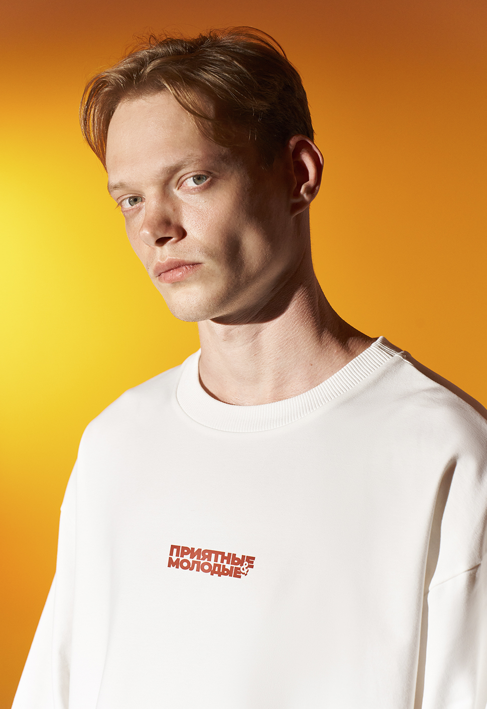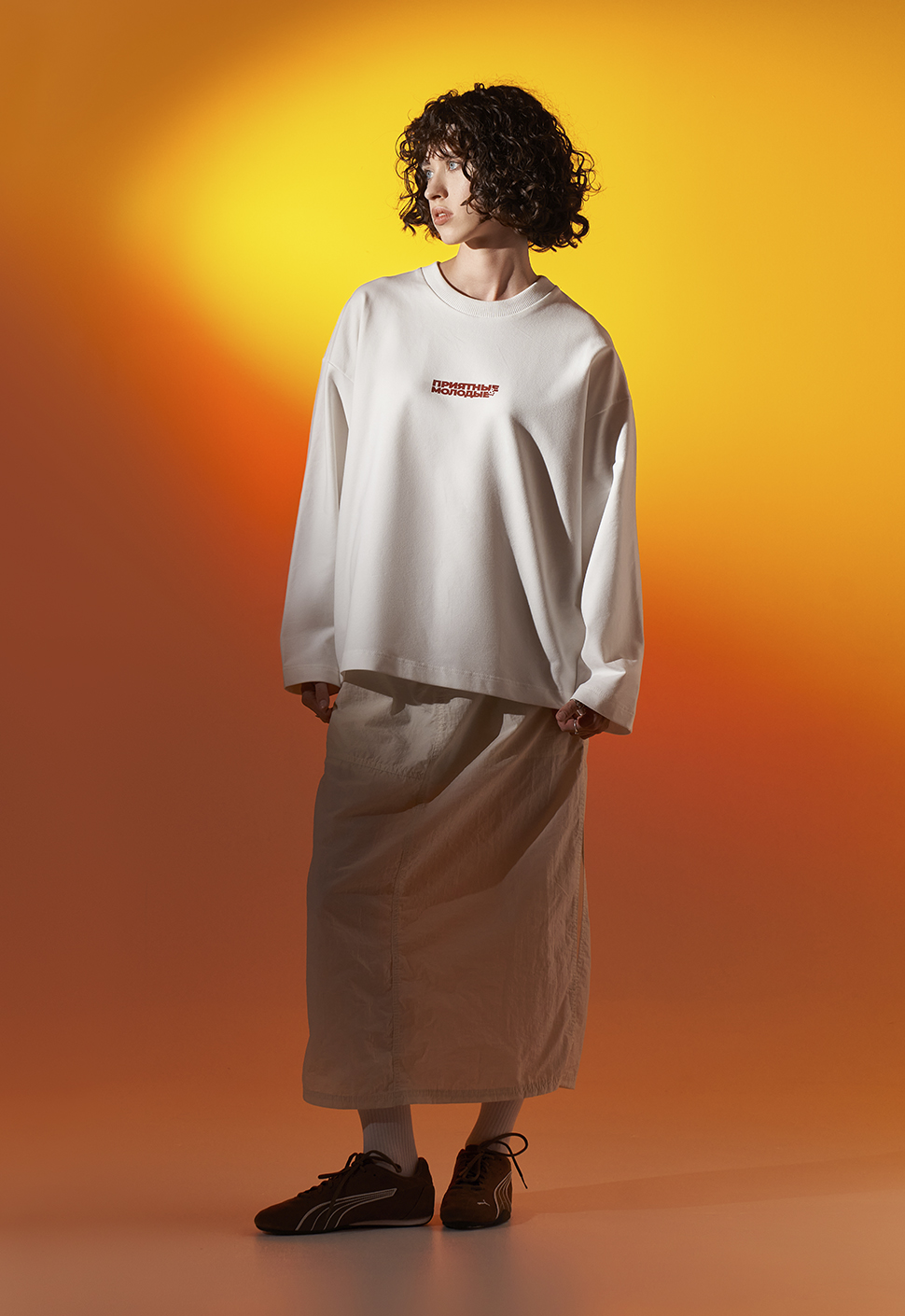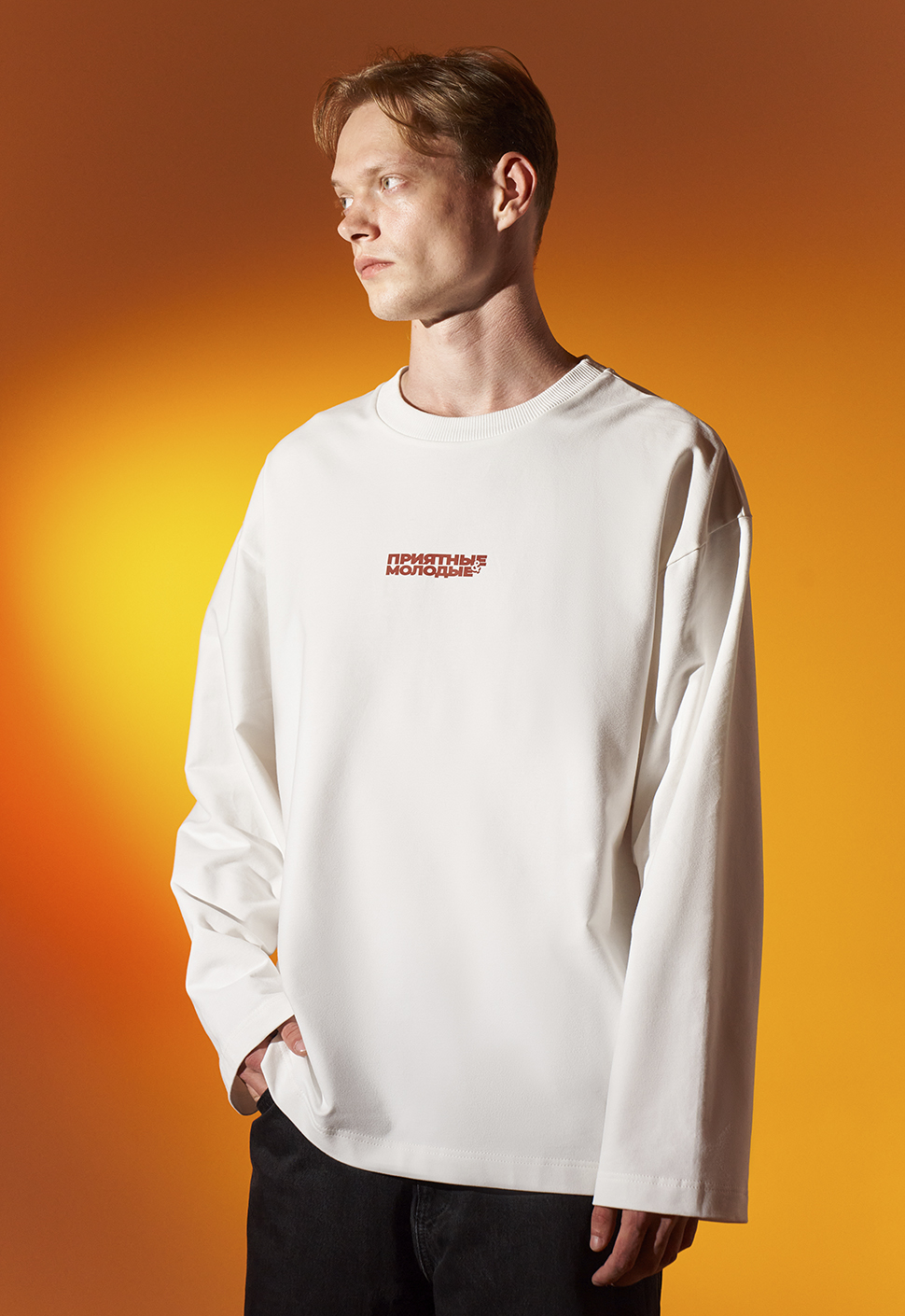 Молочный лонгслив от Приятного Ильдара "Приятные Молодые" oversize кроя выполнен из высококачественного плотного хлопка плотностью 240 гр/м2 .
