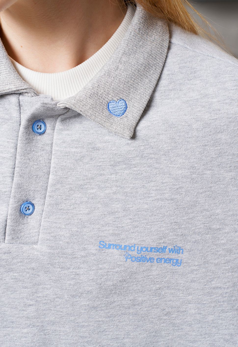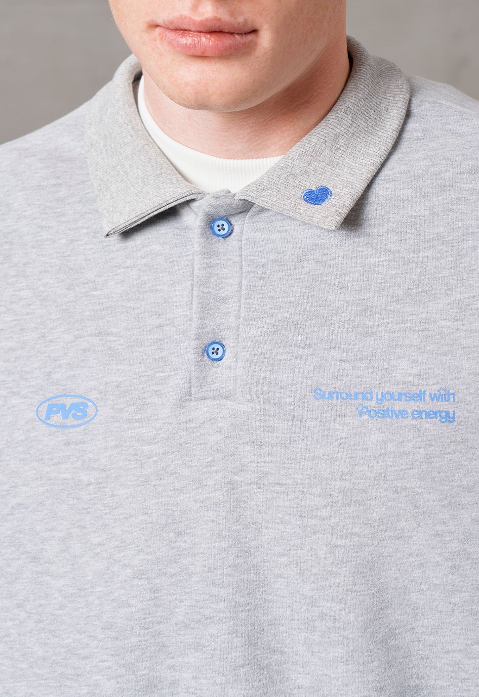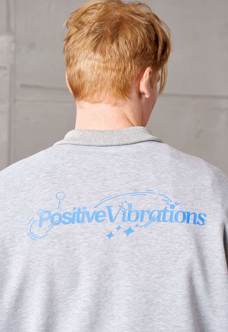 Свитшот-поло от Женька "Positive Vibrations" в цвете серый меланж выполнен из высококачественного хлопка с велюр-эффектом плотностью 320 гр/м2. Модель имеет круглый ворот и Oversize посадку. Принт на груди и спине нанесен шелкографией.