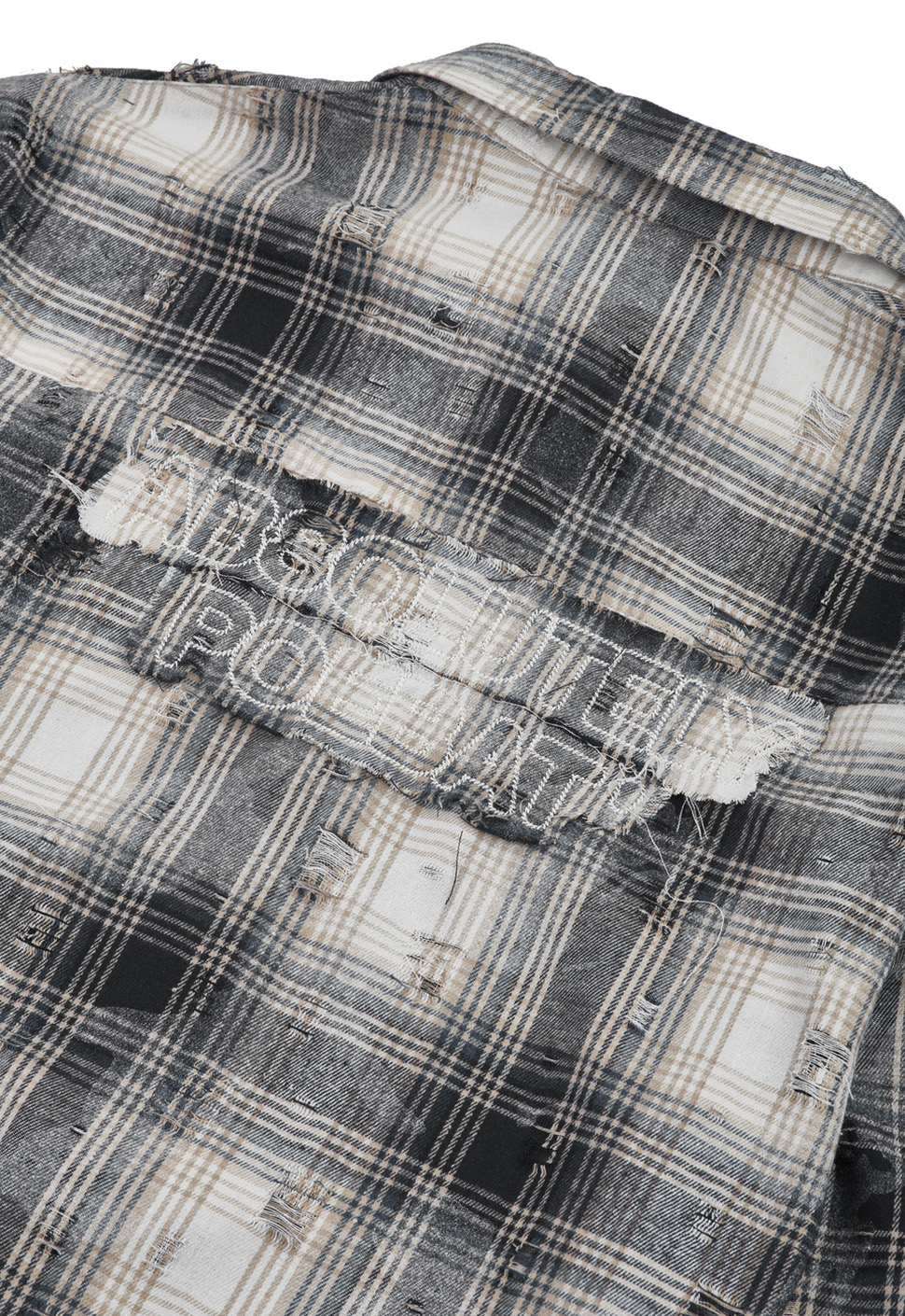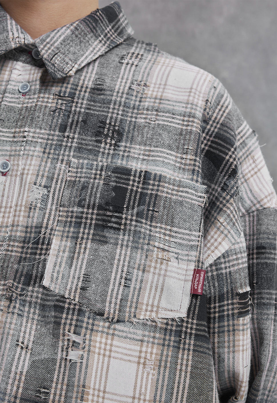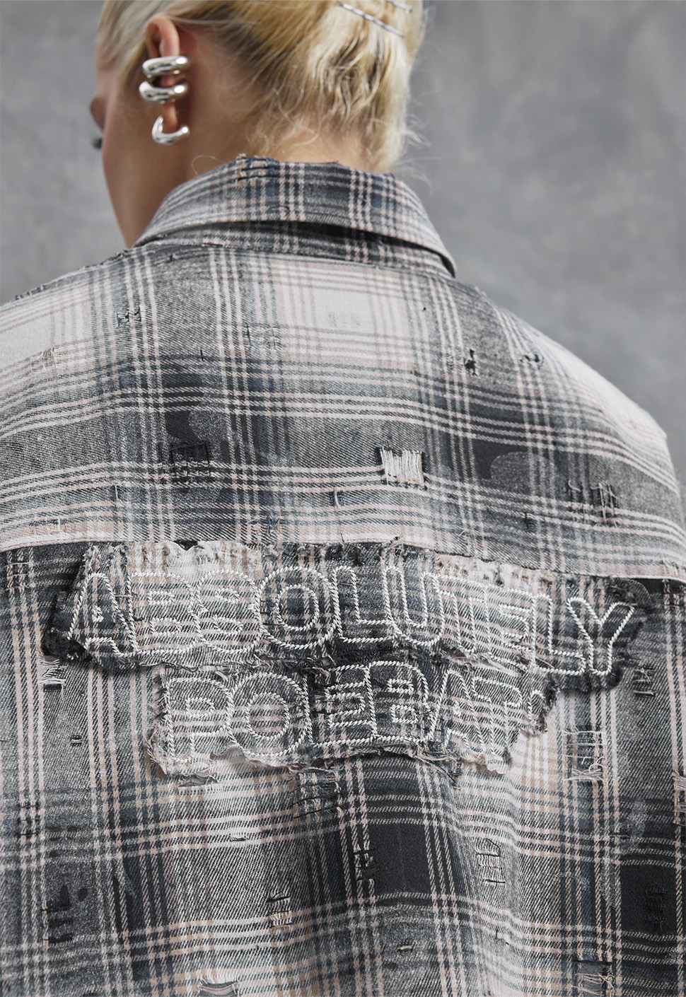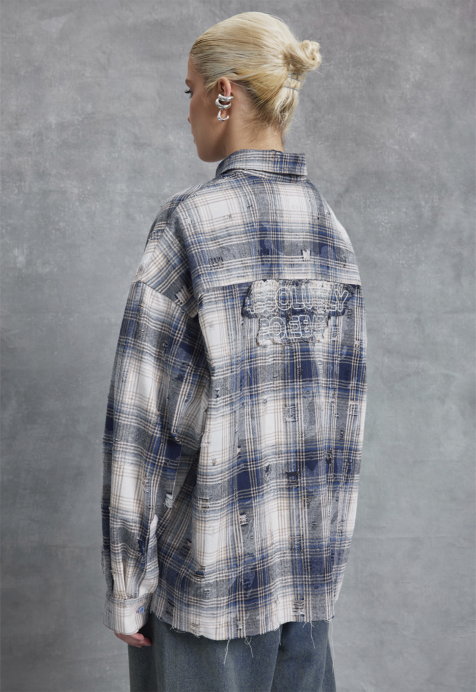 Молочно-синяя рубашка от Приятного Ильдара "Absolutely Po*bat" oversize кроя выполнена из высококачественного 100% хлопка. На передней части изделия расположен карман с фирменной жаккардовой биркой, также на изделии присутствуют контрастные петли, которые делают изделие более акцентным и интересным. Нанесение на спинке изделия сделано машинной вышивкой. Материал рубашки оформлен в стиле гранж — изделие дополнено множеством декоративных порезов и потёртостей.