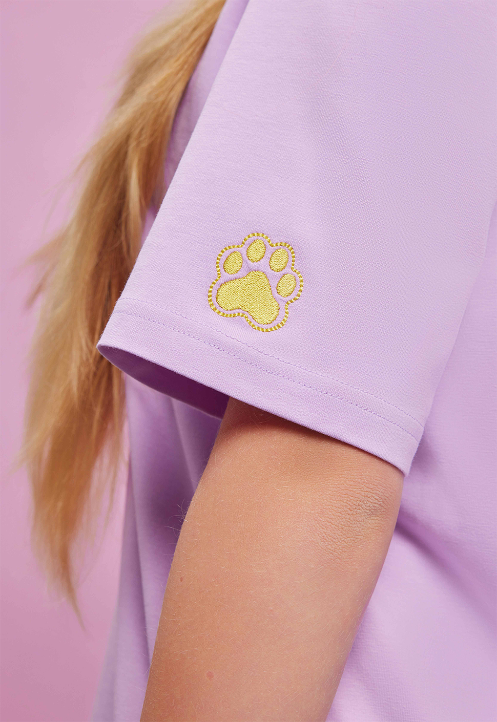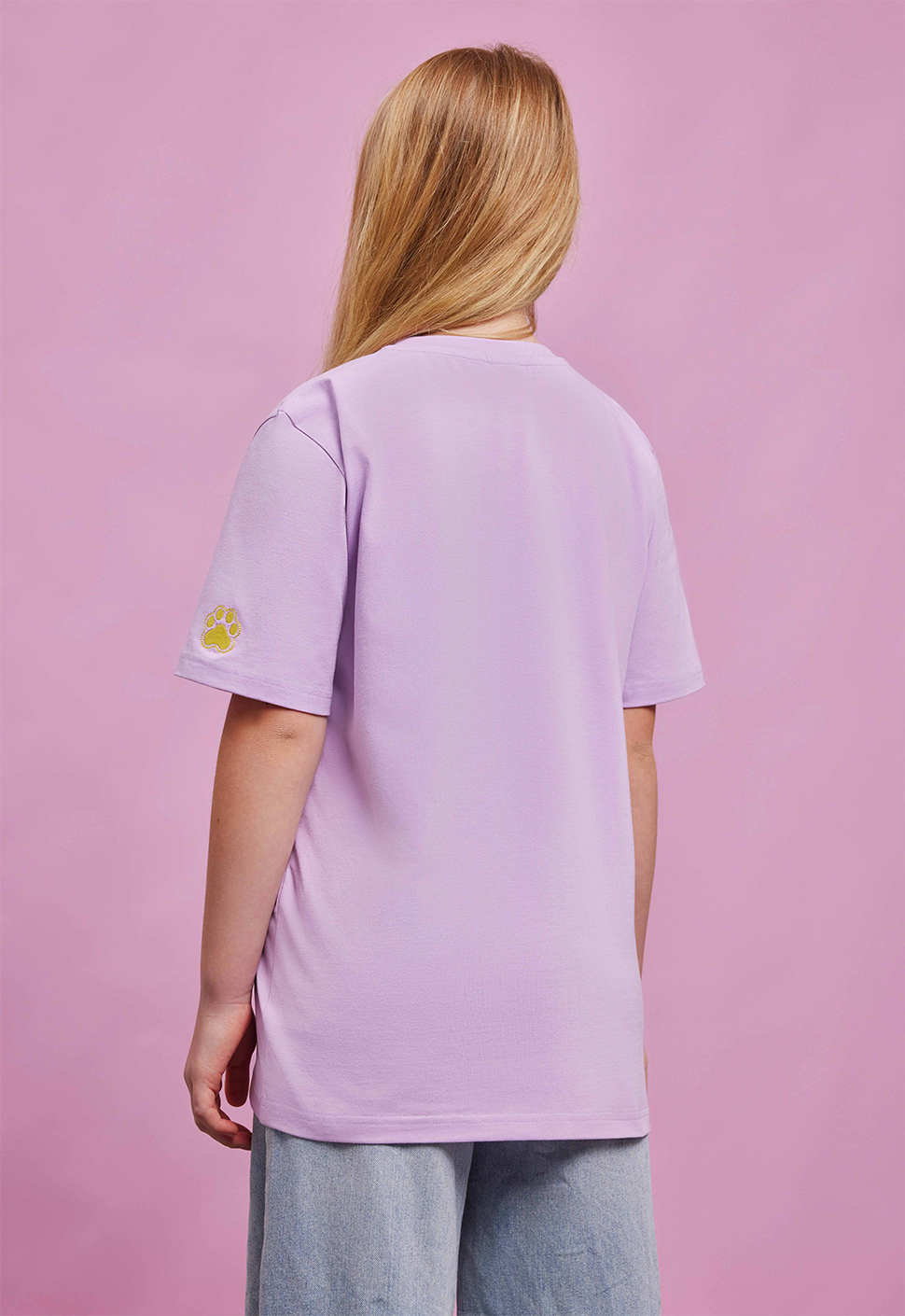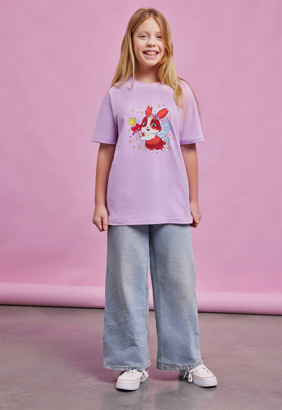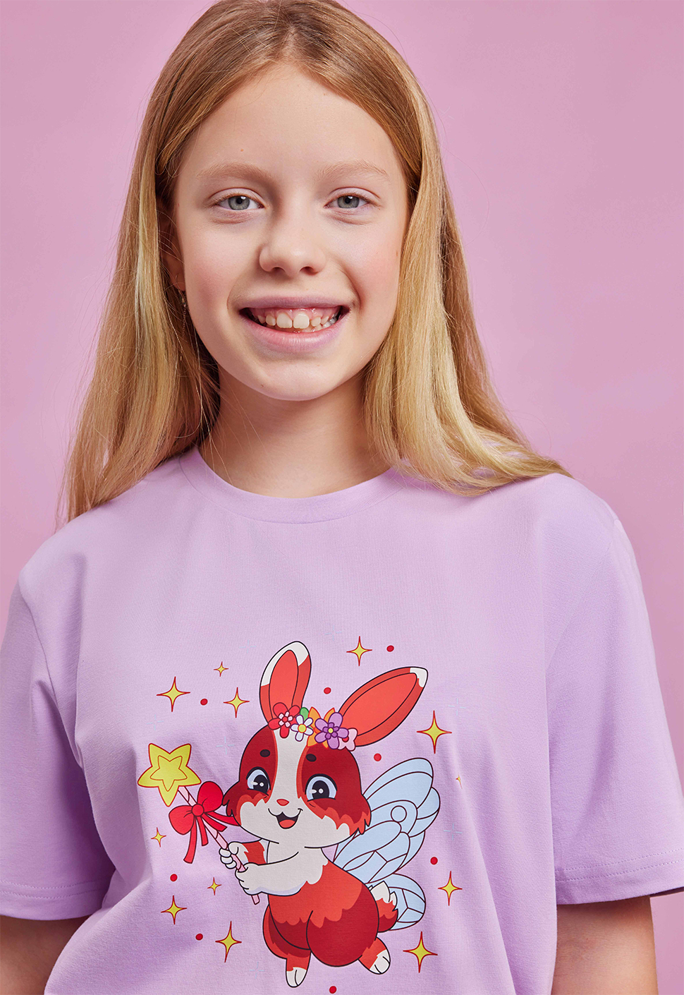 Футболка для девочек "Кроля Баффи" от А ну-ка давай-ка в лиловом цвете выполнена из высококачественного хлопка плотностью 200 гр/м2. Модель имеет круглый ворот, прямой крой и oversize посадку. Принт на груди нанесен методом DTF, на левом рукаве логотип выполнен машинной вышивкой.