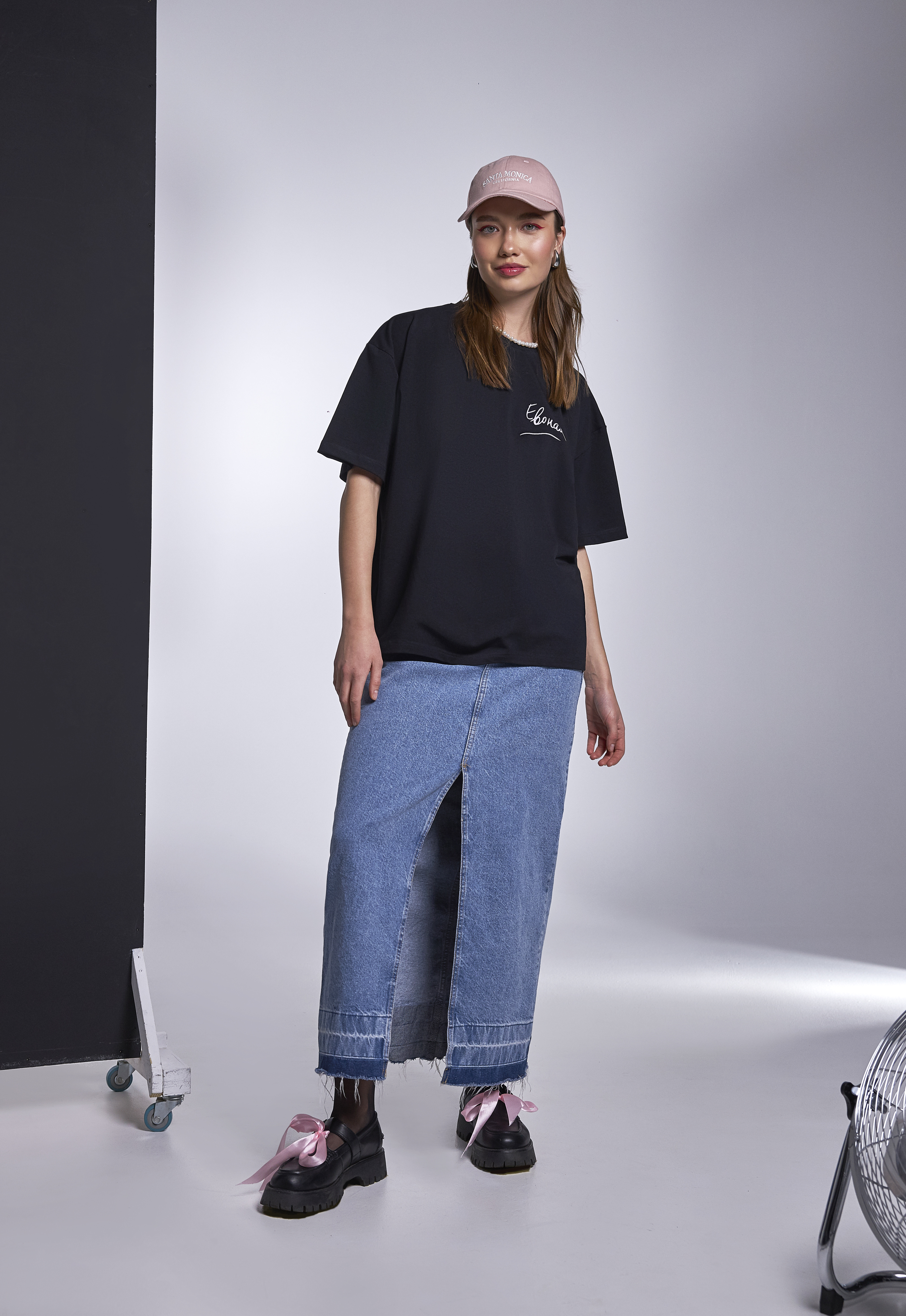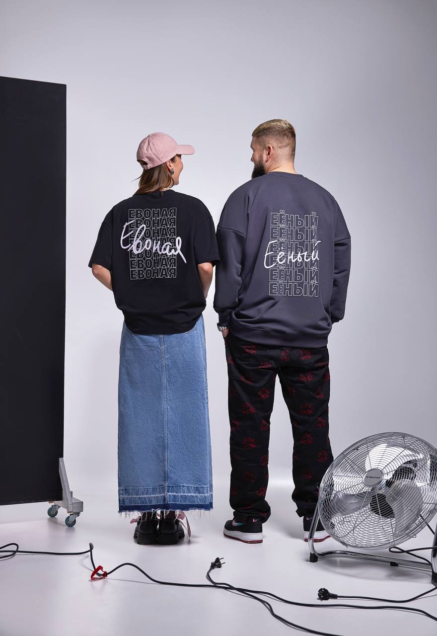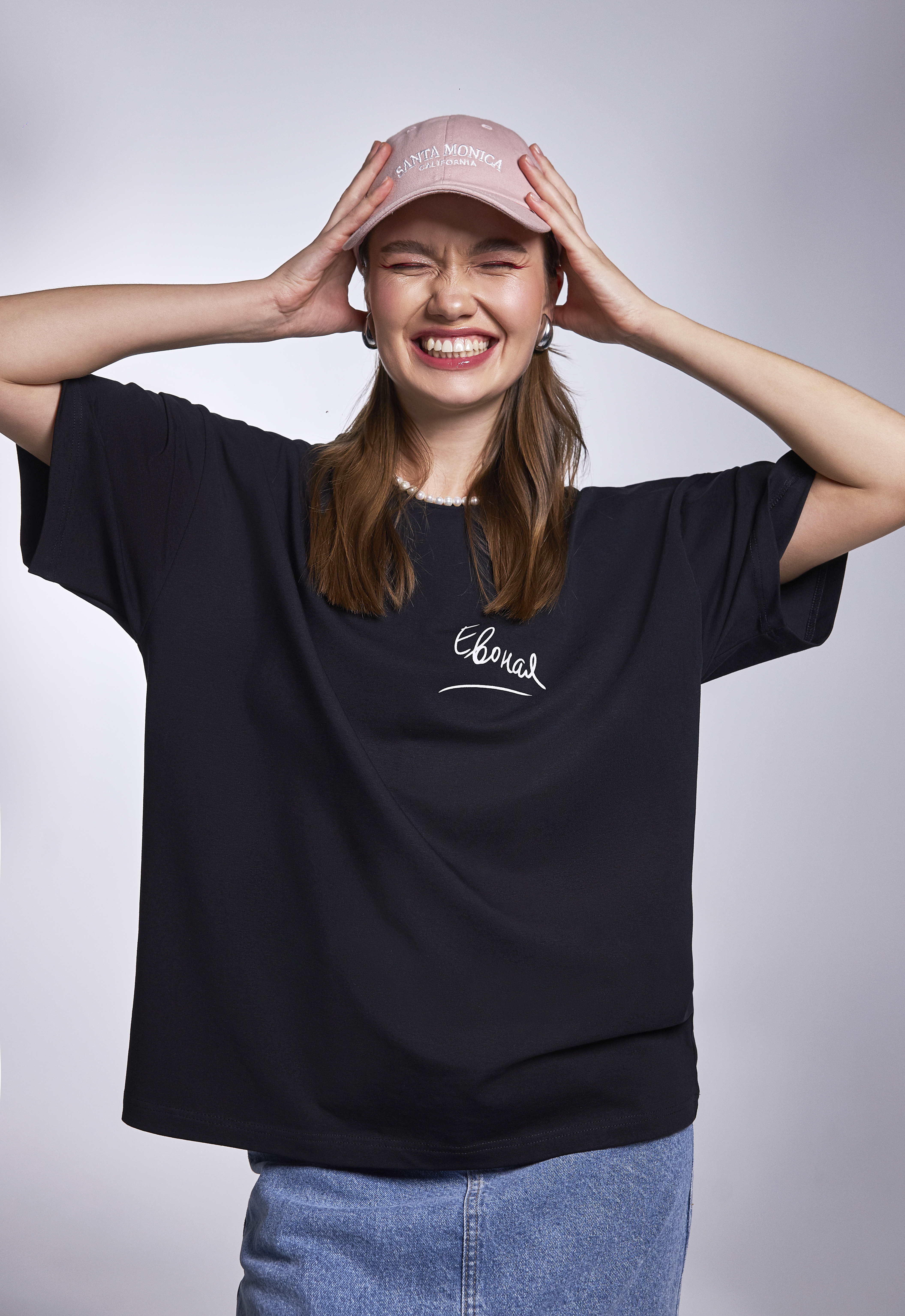 Футболка от Приятного Ильдара "Евоная" в черном цвете выполнена из высококачественного хлопка плотностью 200 гр/м2. Модель имеет круглый ворот и oversize посадку. Принт на груди и спине нанесен шелкографией.
