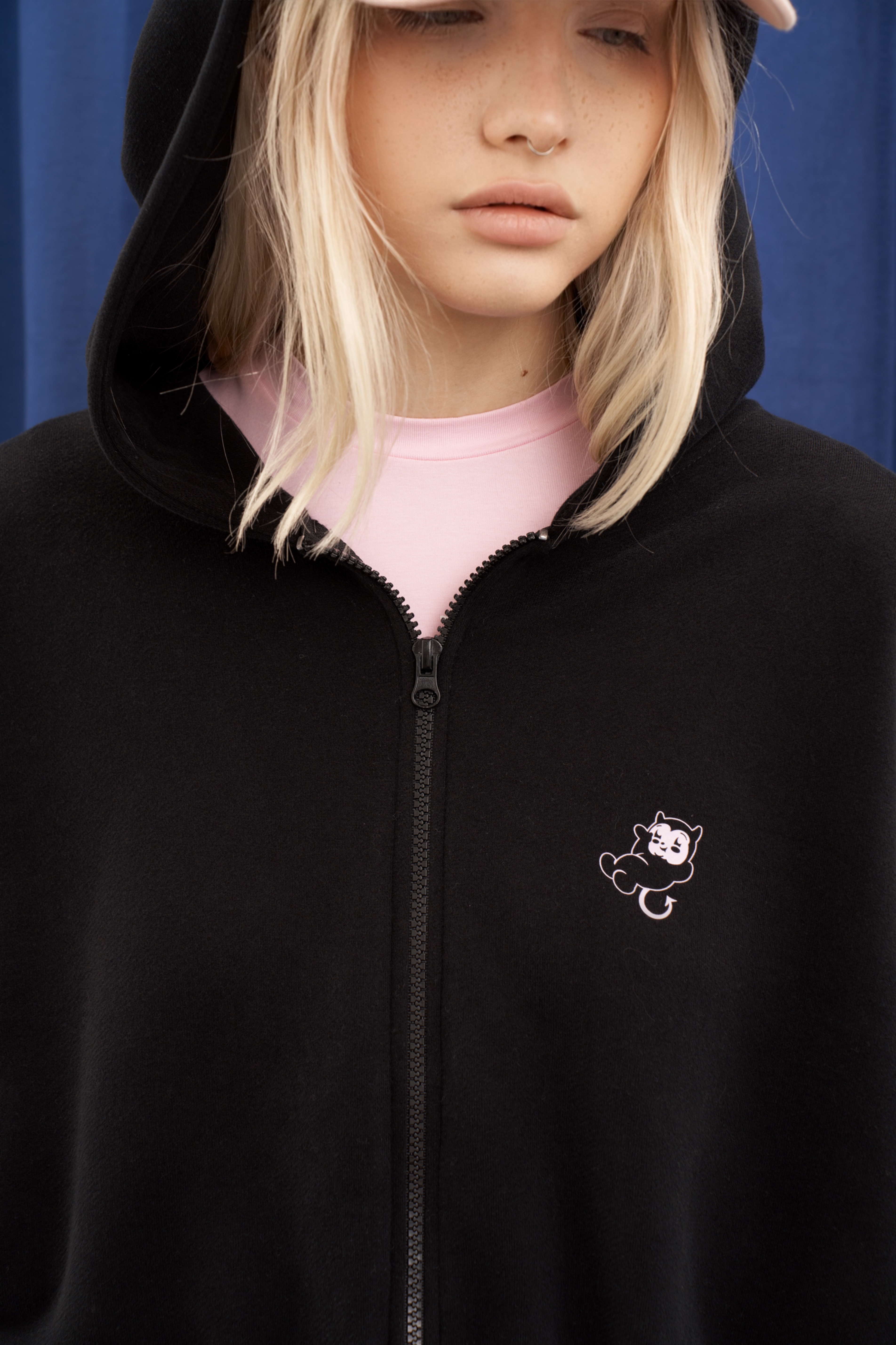 Черное худи от Приятного Ильдара "Тише Маленькая" укороченногокроя выполнена из высококачественного плотного хлопка плотностью 320 гр/м2 с бархатным эффектом. В боковом шве изделия расположена фирменная бирка “Приятный Ильдар”. Принт на груди и спинке выполнен шелкографией.