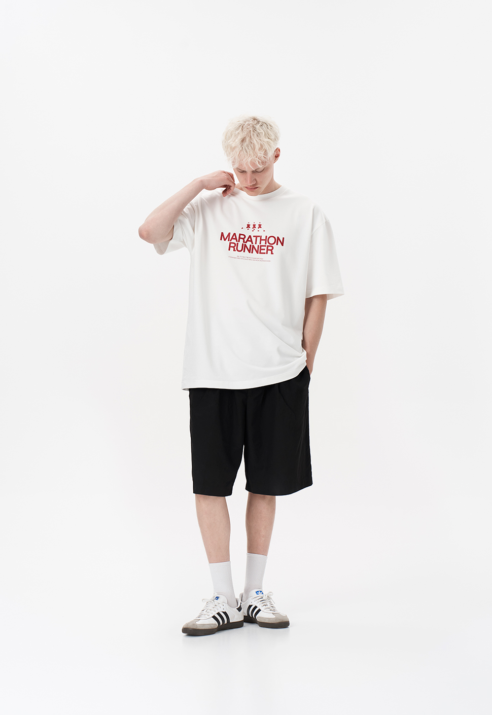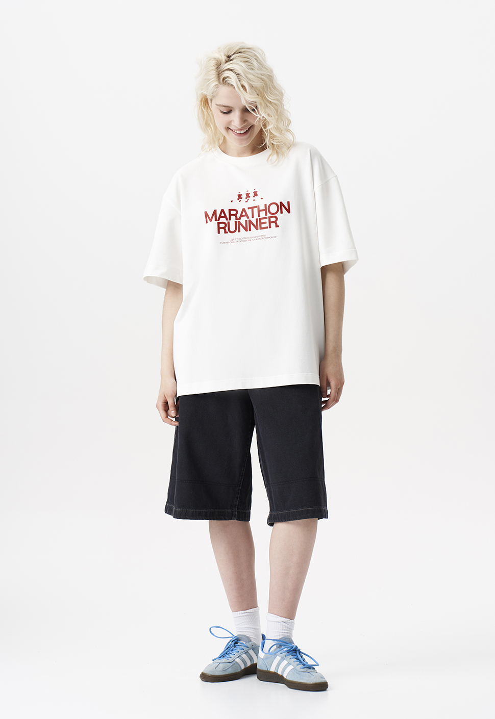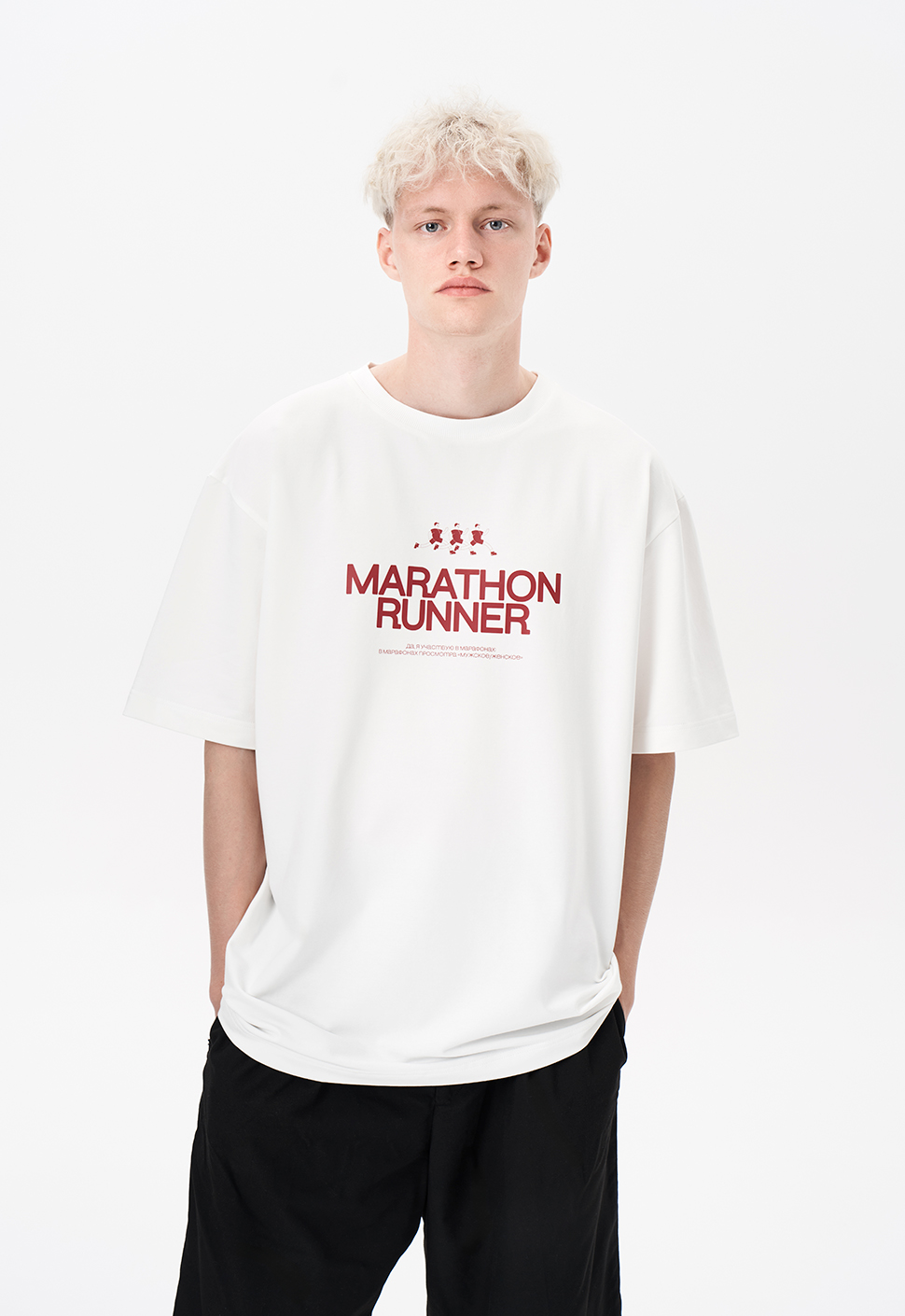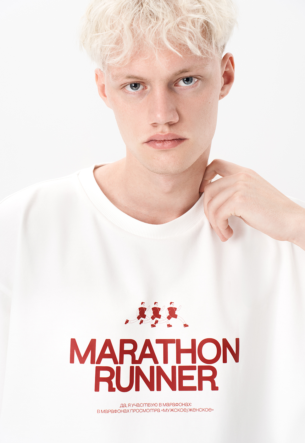 Молочная футболка от Приятного Ильдара "Marathon runner" oversize кроя выполнена из высококачественного плотного хлопка плотностью 240 гр/м2.
