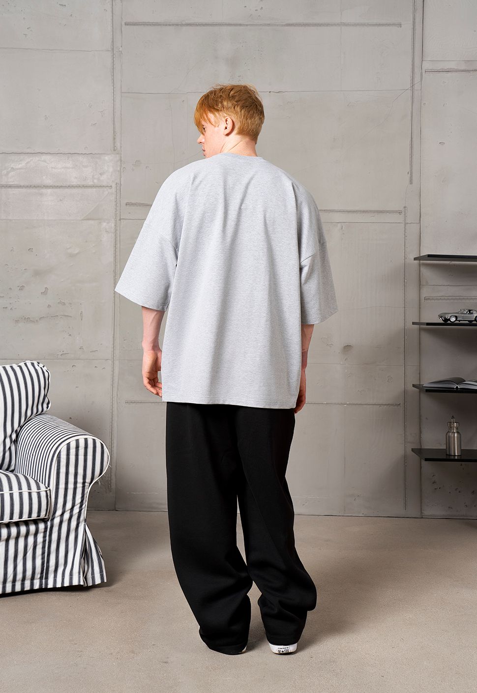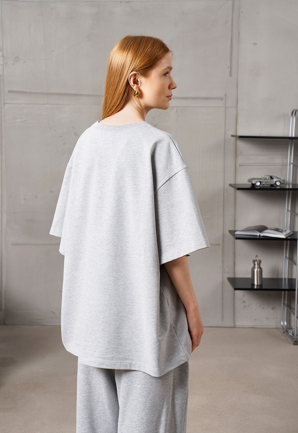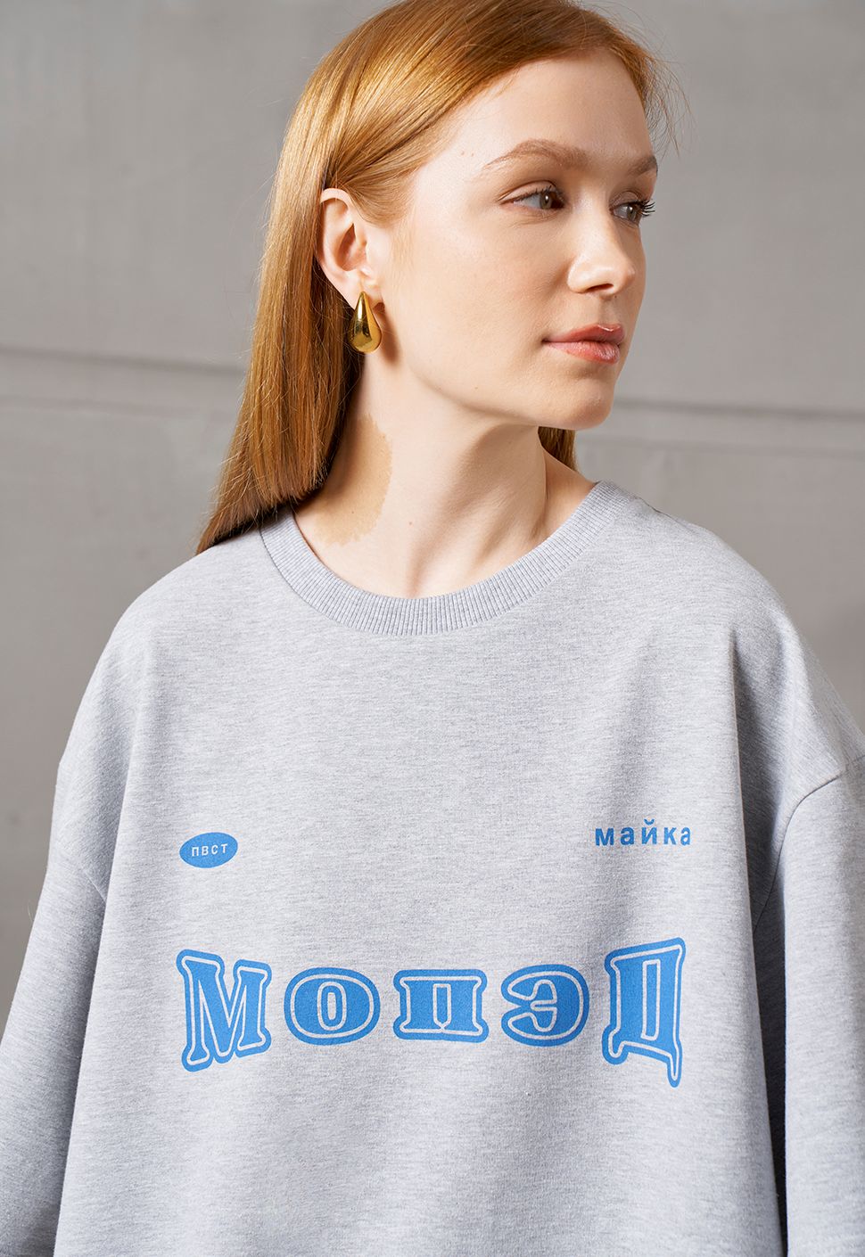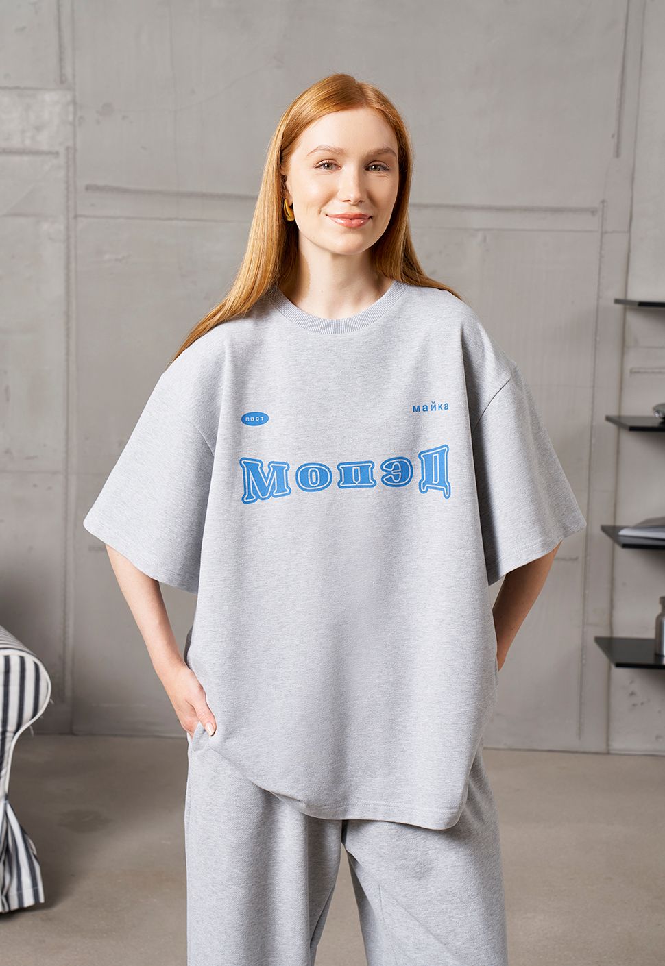 Футболка "МОПЭД" в цвете серый-меланж от Женька выполнена из высококачественного хлопка с примесью эластана плотностью 240 гр/м2. Модель имеет круглый ворот и oversize посадку. Принт на груди выполнен шелкографией.