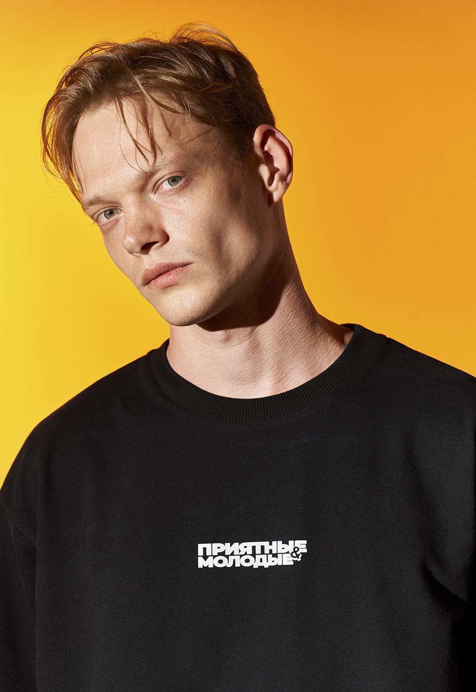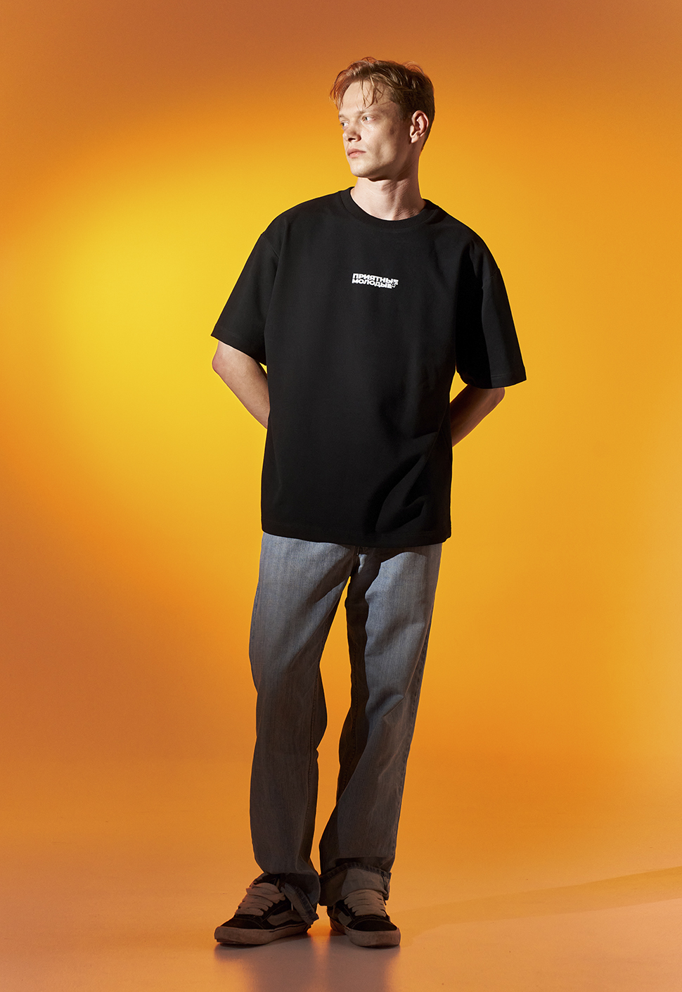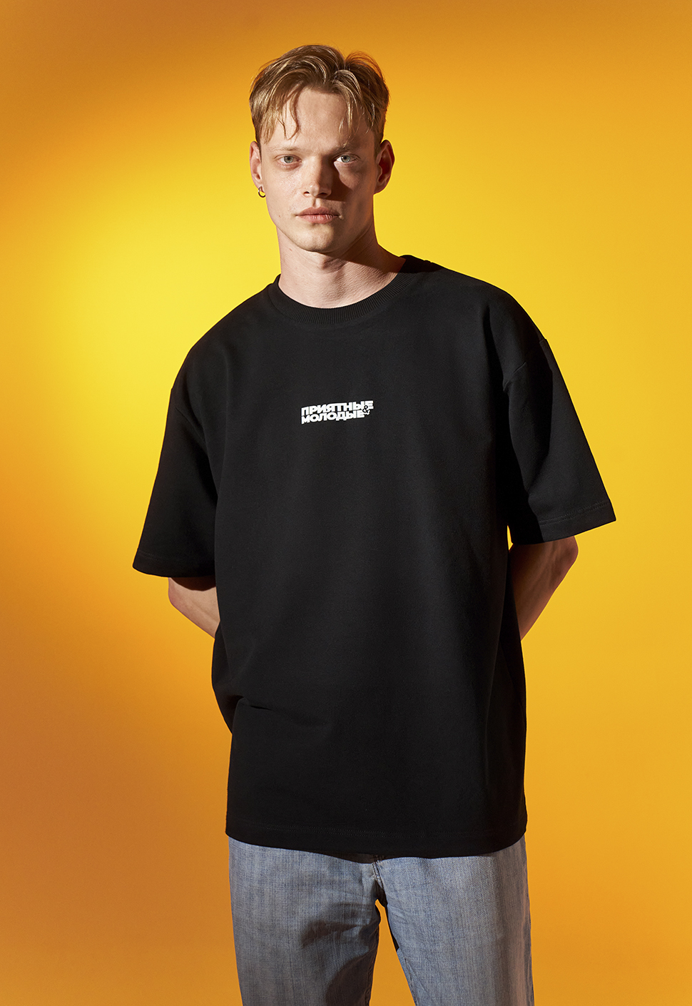 Черная футболка от Приятного Ильдара "Приятные молодые" oversize кроя выполнена из высококачественного плотного хлопка плотностью 240 гр/м2.