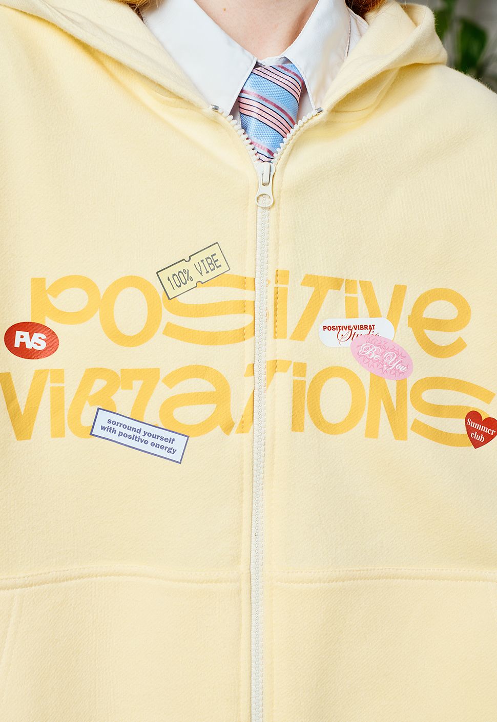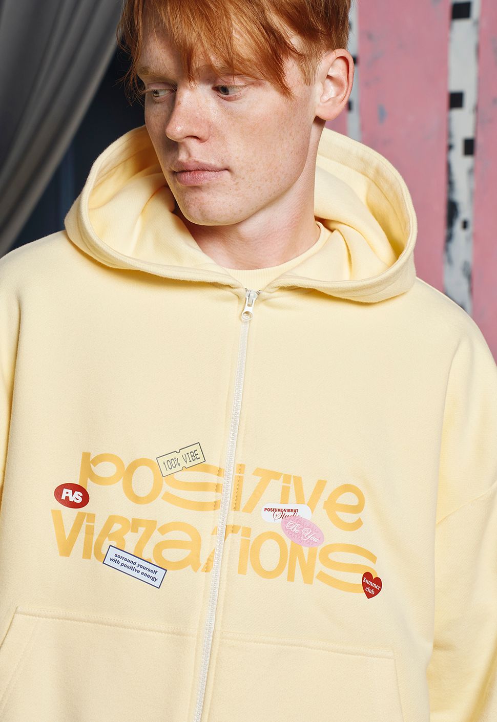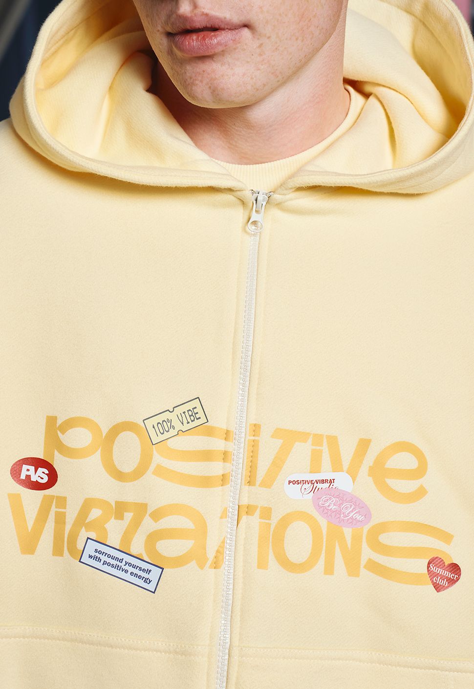 Zip Худи "Позитивные вибрации" сливочное масло выполнено из высококачественного хлопка плотностью 320 гр/м2. Имеет круглый ворот, умеренную длину и oversize посадку. Модель имеет объемный капюшон, Oversize посадку и карман. Принт на груди выполнен шелкографией.