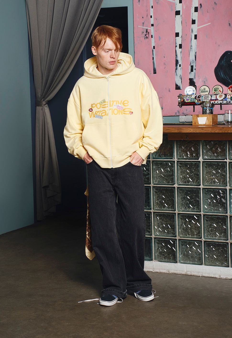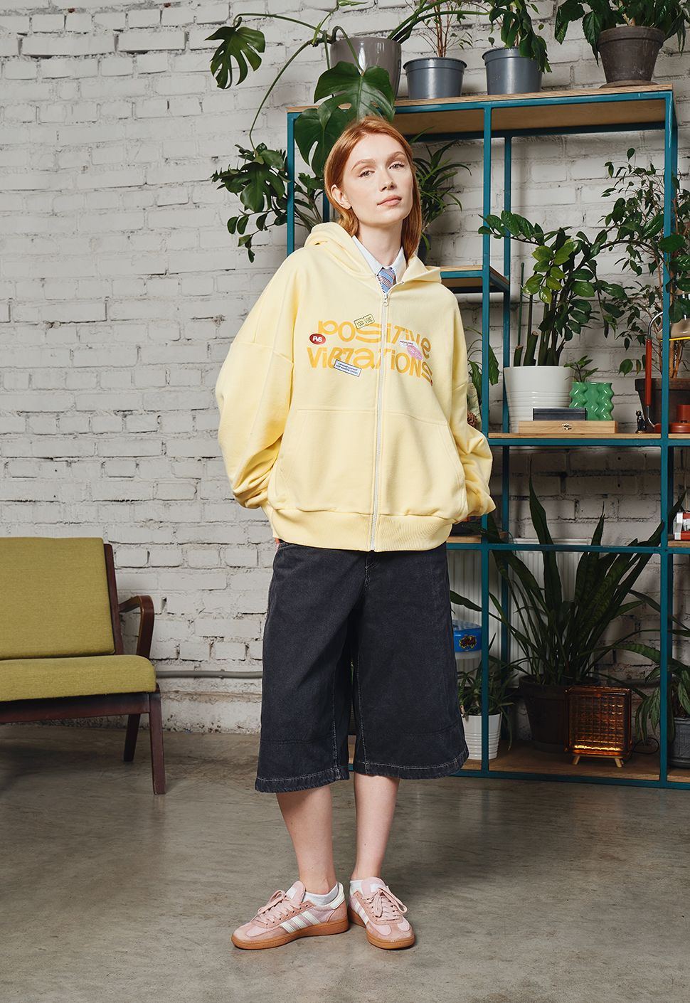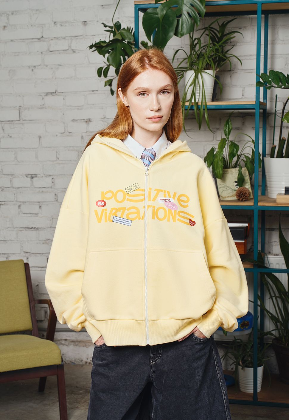 Zip Худи "Позитивные вибрации" сливочное масло выполнено из высококачественного хлопка плотностью 320 гр/м2. Имеет круглый ворот, умеренную длину и oversize посадку. Модель имеет объемный капюшон, Oversize посадку и карман. Принт на груди выполнен шелкографией.